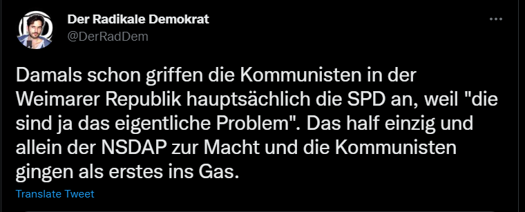 Ich werde nie darüber hinwegkommen, dass es immer die vorgeblichen Antifaschisten sind, die am wenigsten über die Nazizeit wissen. Dieser Tweet signalisiert Halbwissen im wahrsten Sinne des Wortes: Im ersten Satz eine unbequeme Wahrheit, die heutzutage gerne verdrängt wird, im zweiten obszönes Unwissen. Nein, Herr Oberdemokrat, die Kommunisten gingen nicht als erste ins Gas, sondern als erste ins KZ. Die ersten Gastoten waren geistig Behinderte, dann folgten Millionen von Juden. Deutsche Kommunisten gehörten zu denen, die im KZ die besten Überlebenschancen hatten.