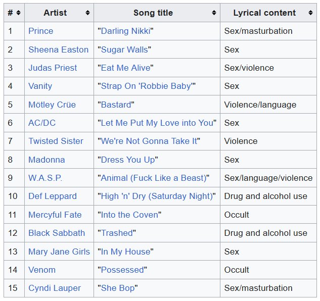 Im Zusammenhang mit dem Parental-Advisory-Label muss man noch die “Filthy Fifteen” nennen. Neben Prince’ Darling Nikki gab es 14 weitere Lieder, die als besonders anstößig galten und zur Einführung des Labels beigetragen haben.