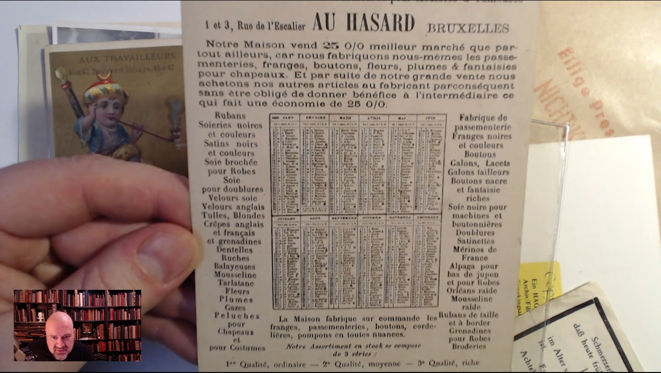 @Sebastian_Kuboth Bzw, „Au Hasard“ war tatsächlich ein reales Geschäft in Brüssel, wahrscheinlich eine Mercerie bzw. ein Mode-Zubehörladen in der Rue de l’Escalier, der Stoffe, Bänder und Dekorationen für Kleidung und Hüte verkaufte.