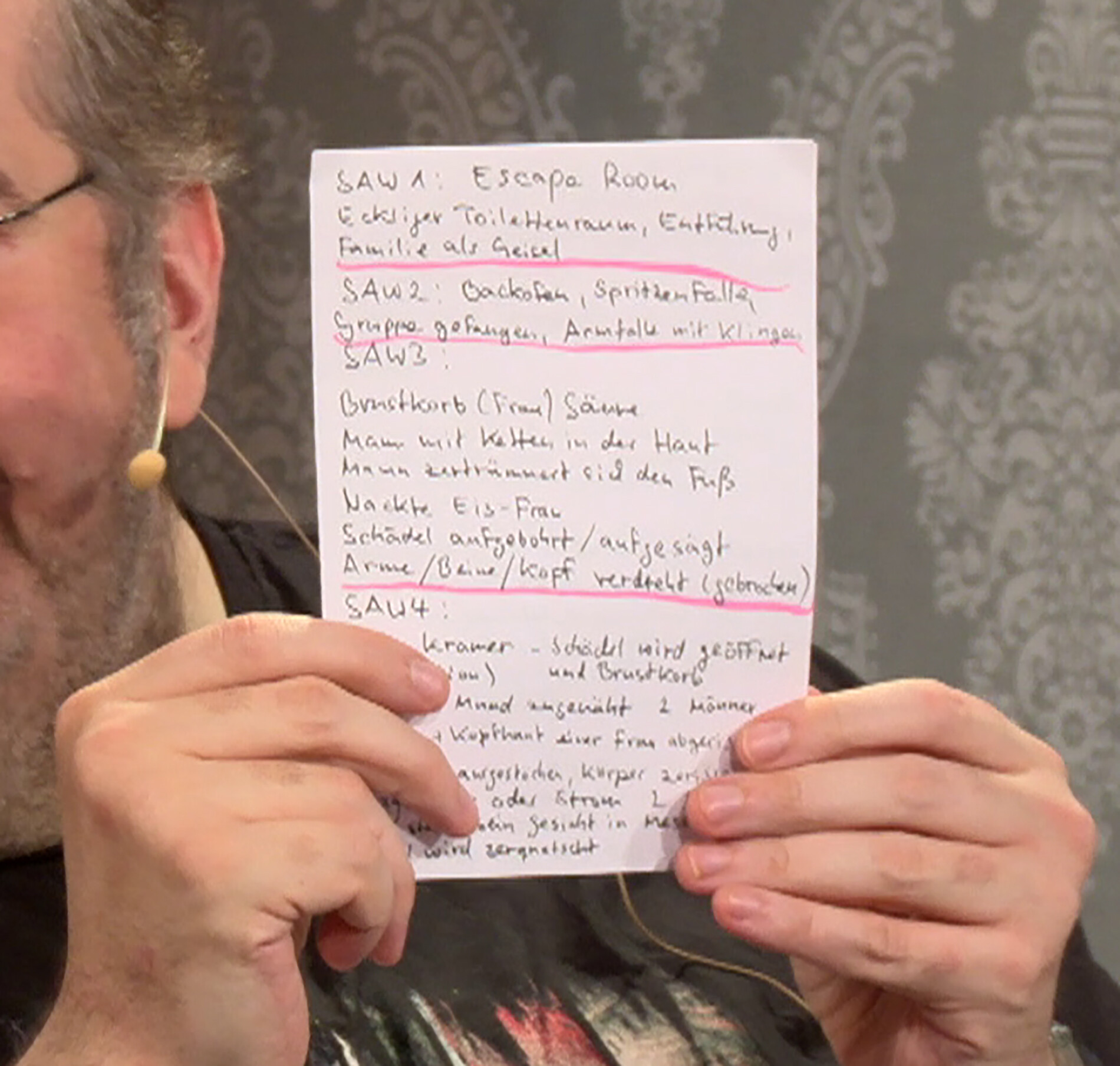Was ich noch besser gefunden hätte, wäre eine noch besser strukturierte und moderierte Sendung mit einzelnen Themenabschnitten. Ihr habt euch natürlich so grob für den logischen chronologischen Weg entschieden, aber viele Einschübe kamen dann eher zufällig, was gerade einem in den Sinn kam zum aktuellen Film. Hätte mir das Thema „Fallen“ nochmal gesondert gewünscht, was ja Saw auch besonders macht, wo ihr die ganze Reihe betreffend darüber spricht und eure Lieblingsfallen nennt und auf einzelne eingeht, statt sie so mehr unsortiert zufällig hier und da und weit von der Vollständigkeit entfernt über die Sendung verstreut einwerft.