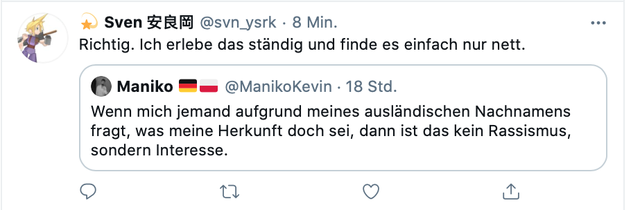 Deswegen ist es dann trotzdem nett gemeint vom Fragenden - und hat mit Rassismus nichts zu tun.