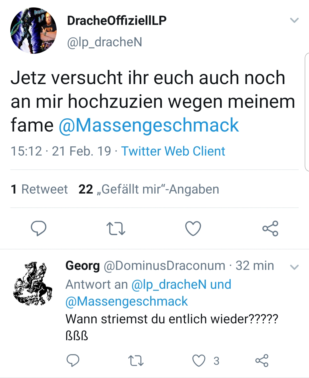 Ich hab mir das tatsächlich komplett angetan. Ich weiß nicht, ob ich schon jemals so viel Dummschwatz am Stück ertragen haben. Meiner Meinung reichts jetzt auch mit dem Drachenlord auf Massengeschmack.