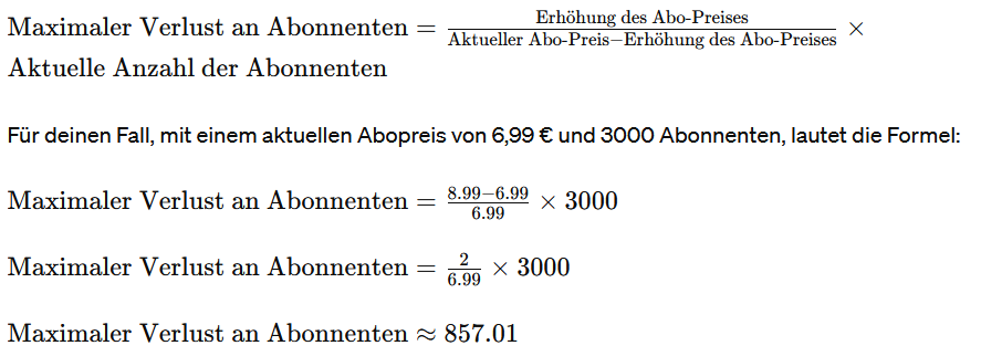 Ich habe das mal ausgerechnet, wieviele Abonnenten du bei einer Preiserhöhung um 2 Euro für das Basisabo verlieren könntest, um nicht in die Verlustzone zu geraten (3000 Basisabonnenten vorausgesetzt)