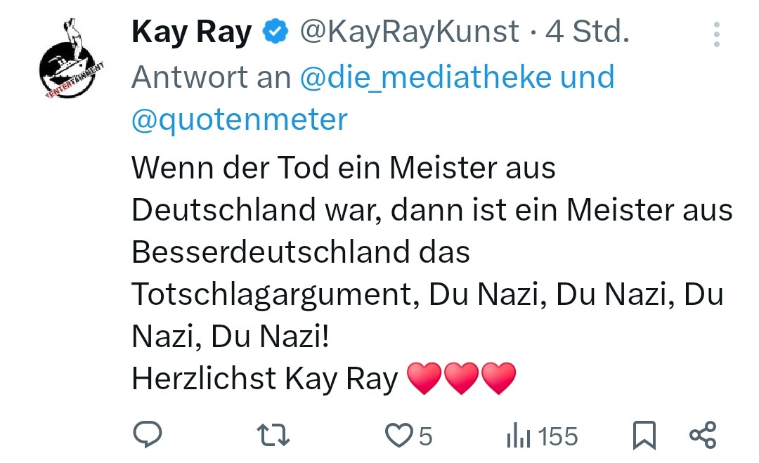 Die Posts die er macht haben ca. 50 - 80 Impressions. Kein Schwein nimmt Notiz von diesem Account.