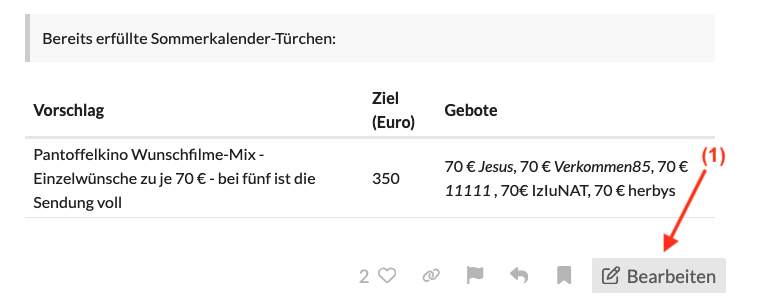 Anschließend scrollt man im Editor runter, bis die Liste erscheint und ergänzt dort die Idee oder die Summe, die man bezahlen möchte (2).