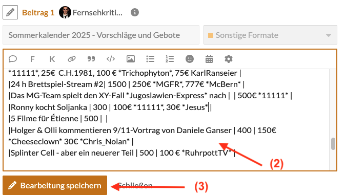 Könnte dazu nicht mal ein Step by Step Video oder eine bebilderte Anleitung erstellt werden? Das ganze könnte man dann immer plakativ verlinken, wenn es um das Eintragen von Geboten oder das Erstellen neuer Vorschläge geht?