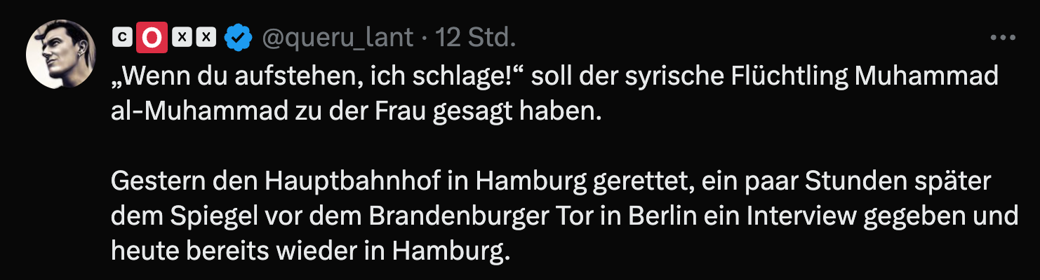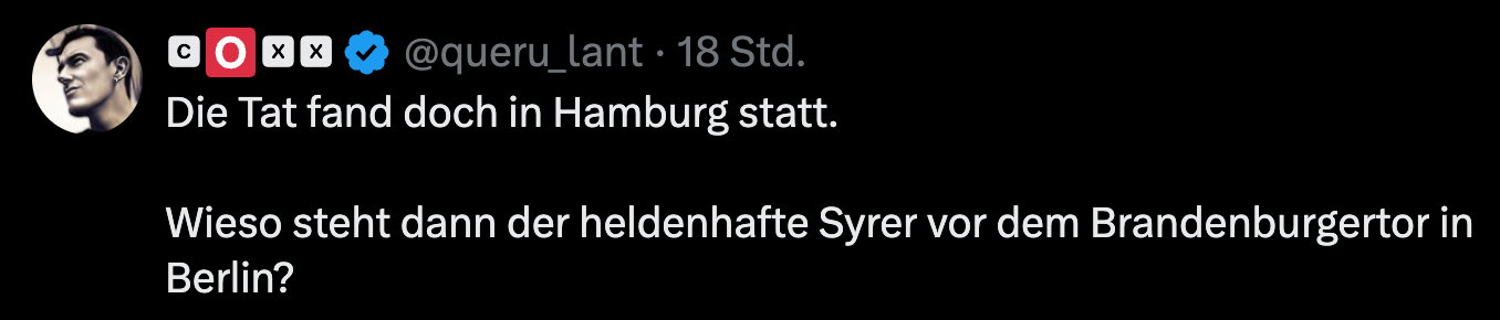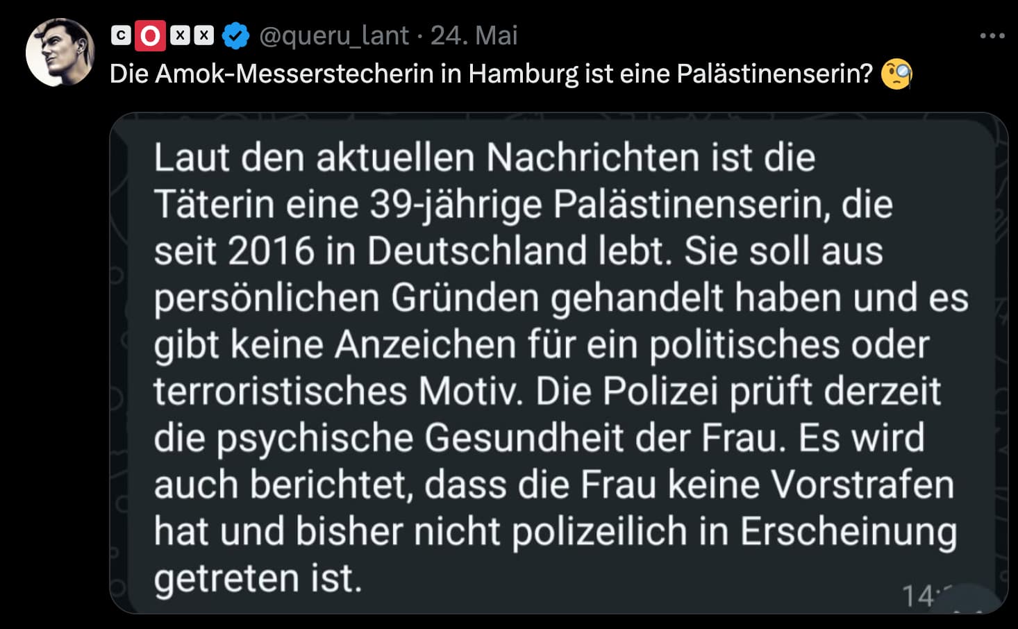 Rechte kommen nicht darauf klar, dass bei der Messerstecherei in Hamburg die Täterin eine Deutsche und die Männer, die sie aufhielten ein Syrer und ein Tschetschene waren und verbreiten Fake News und Verschwörungstheorien am laufenden Band. Die Frau (in Braunschweig geboren) sei eigentlich eine seit 2016 in Deutschland lebende Palästinenserin, es werden KI-Fake-Fotos geteilt die ein Closeup der Frau bei der Verhaftung zeigen (auf südländisch getrimmt), und überhaupt sei es eine große Verschwörung, weil in einem Artikel des Spiegels ein Foto des Syrers verwendet wird, das ihn vor dem Brandenburger Tor zeigt. Wie könne er denn gestern noch in Hamburg gewesen sein, heute schon in Berlin? (Dass unter dem Foto „Privataufnahme“ steht und es sich um ein altes Bild handelt, wird ignoriert) Auch sei die verhaftete Frau gar nicht die Täterin, denn man hat ihr den Rucksack nicht abgenommen und ein WeLT-Reporter habe schließlich vor Ort live berichtet, dass es ein Mann sei.