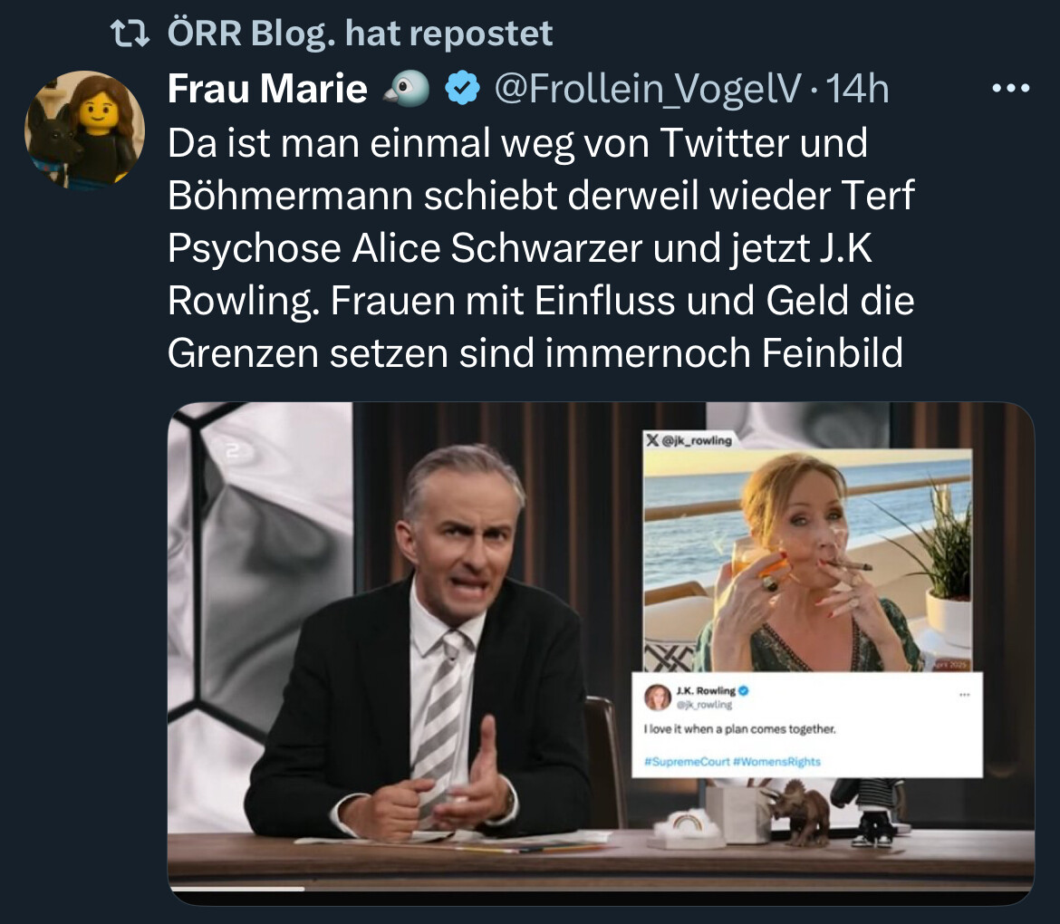 Was macht der ÖRR-Blog? Retweetet Marie-Luise Vollbrecht, die Böhmi eine „TERF- und Nadsi-Psychose“ unterstellt.