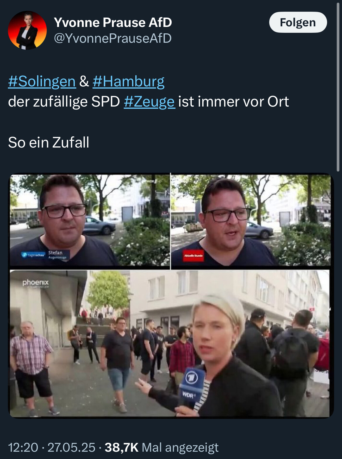 Brandenburgische AfD-Kandidatin verbreitet die Verschwörungstheorie, dass der Zeuge Stefan, der die Messerattacke von Solingen miterlebte, auch beim Messerangriff von Hamburg zugegen war. Das ist gelogen, gezeigt werden nur Bilder aus Solingen.
