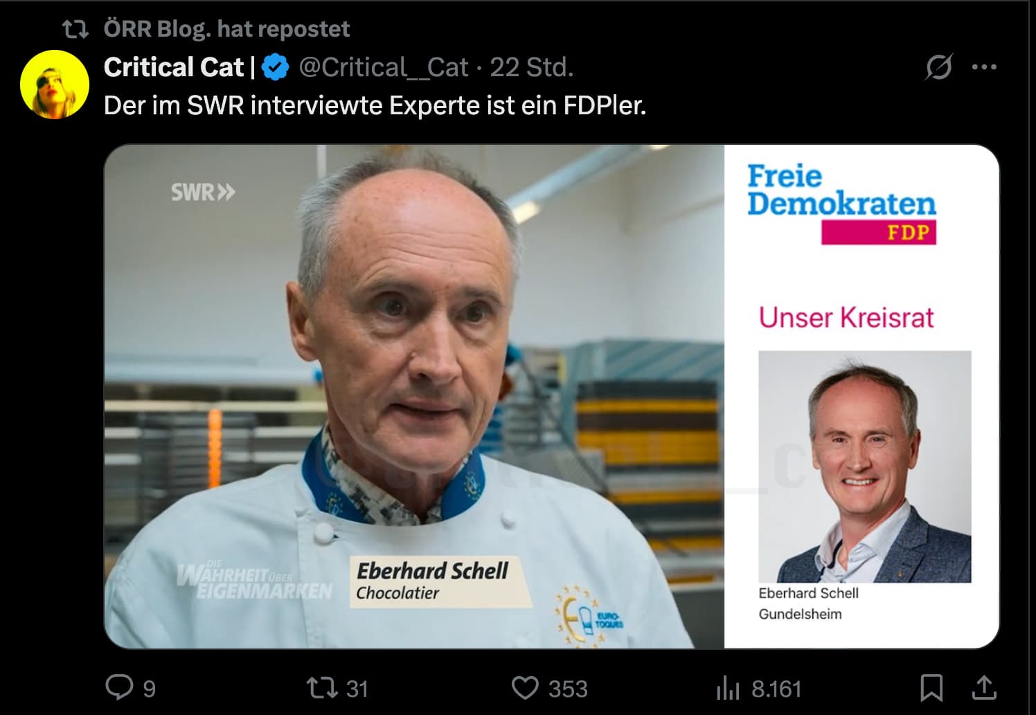 ÖRR-Kritik ad absurdum. In einer Reportage zum völlig politikfernen Thema „Lebensmittel-Eigenmarken“ kommt ein Chocolatier zu Wort. Dieser ist FDP-Lokalpolitiker in einer 7000-Einwohner-Stadt. Er haut in der Reportage radikalliberale Talking Points raus wie: