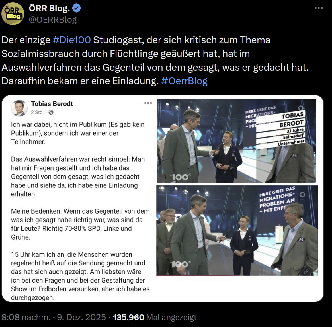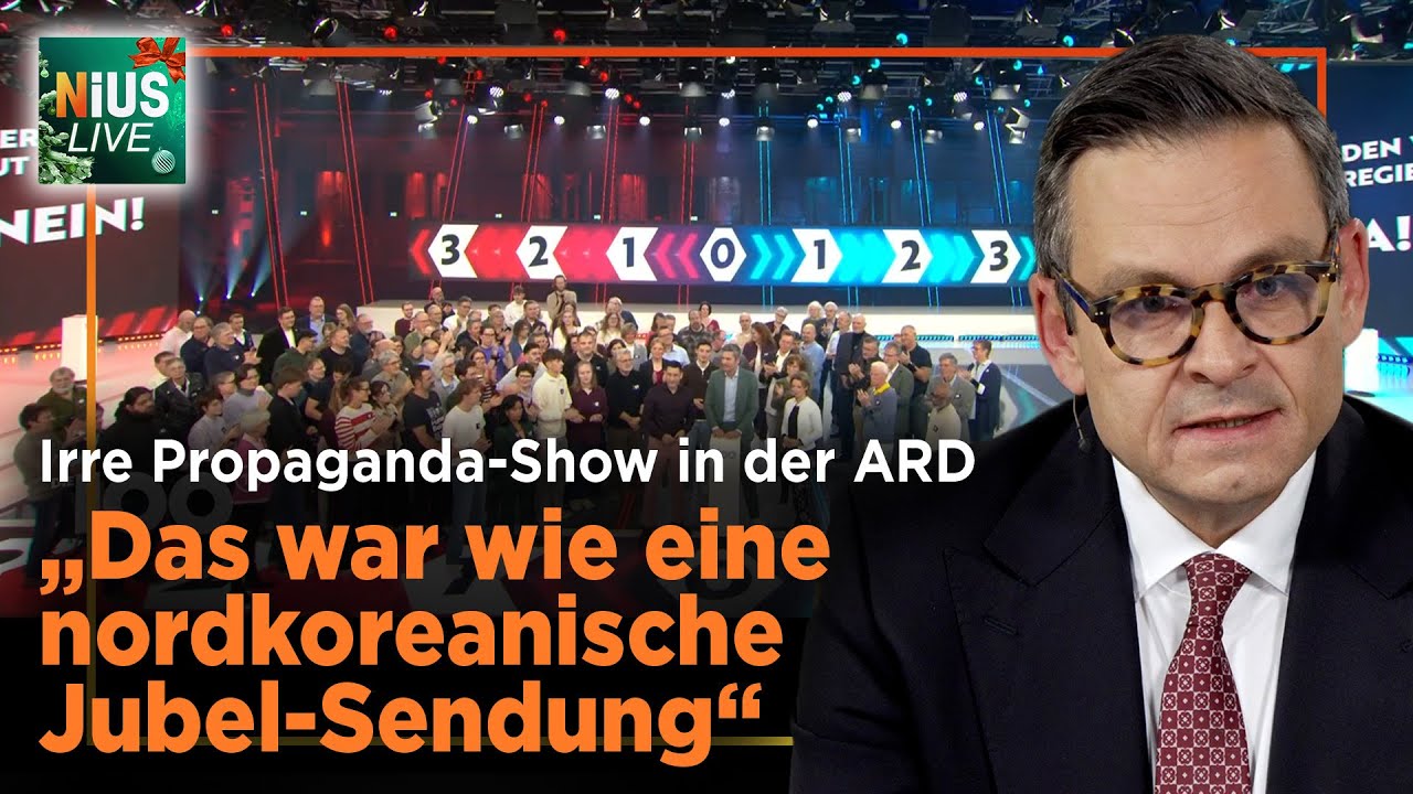 NIUS verschweigt in dem Beitrag, dass das Konzept der ARD-Sendung auf Dialektik setzt. Es gab eine Pro- und eine Contra-Seite, doch NIUS zeigt fast auschließlich Beiträge der PRO-Regierungs Seite und stellt das als Grundtendez und Propaganda der ARD hin!