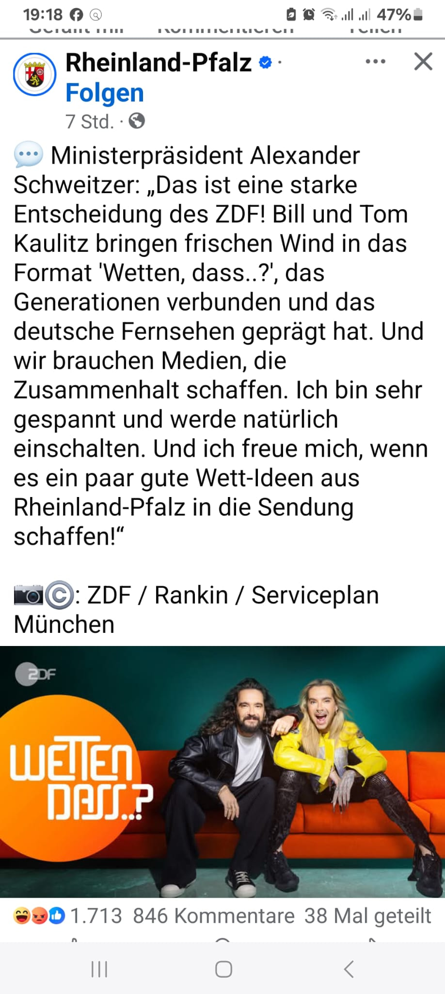 Auch der Ministerpräsident von Rheinland-Pfalz lässt sich auf der landeseigenen Facebookseite zitieren und freut sich auf die Sendung mit den „Ungepflegt-Zwillis“ und gratuliert dem ZDF, das damit Inhalte bringe, „die Zusammenhalt schaffen“.