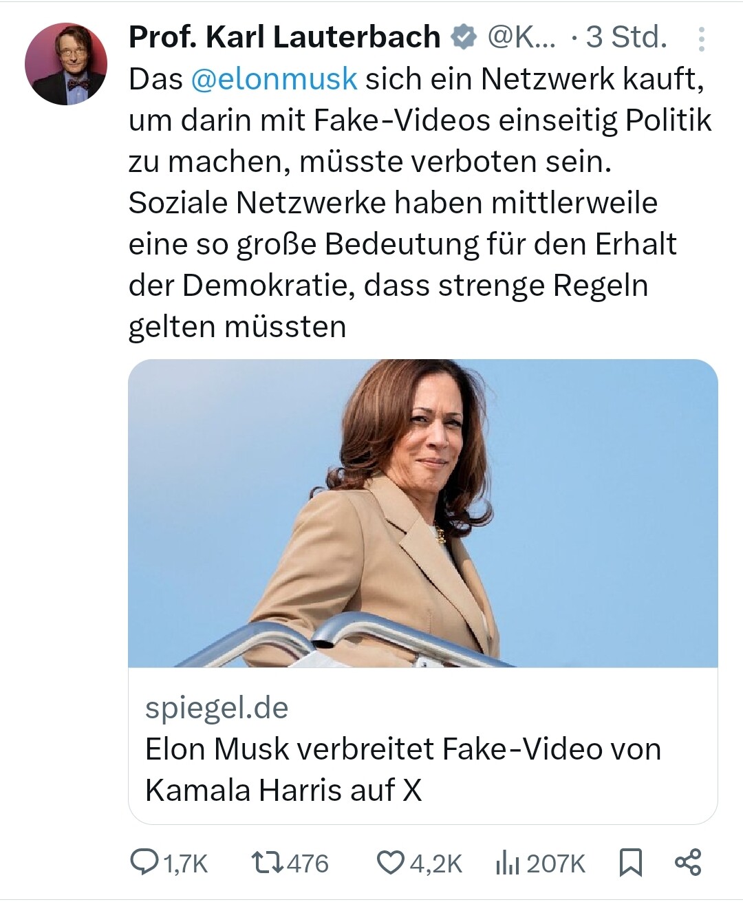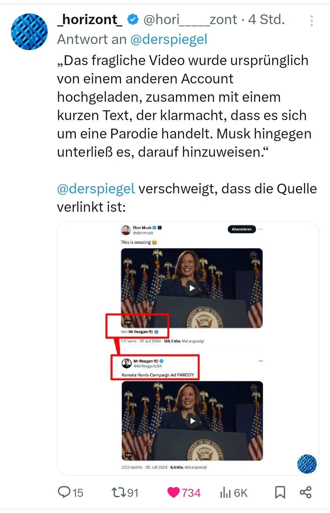 Spiegel skandalisierte, dass Musk ein Parodievideo von Harris teilt (weißt kleinlaut aber später darauf hin, dass es ein Satirevideo war). Lauti springt munter drauf. Ein Skandal, der keiner ist.
