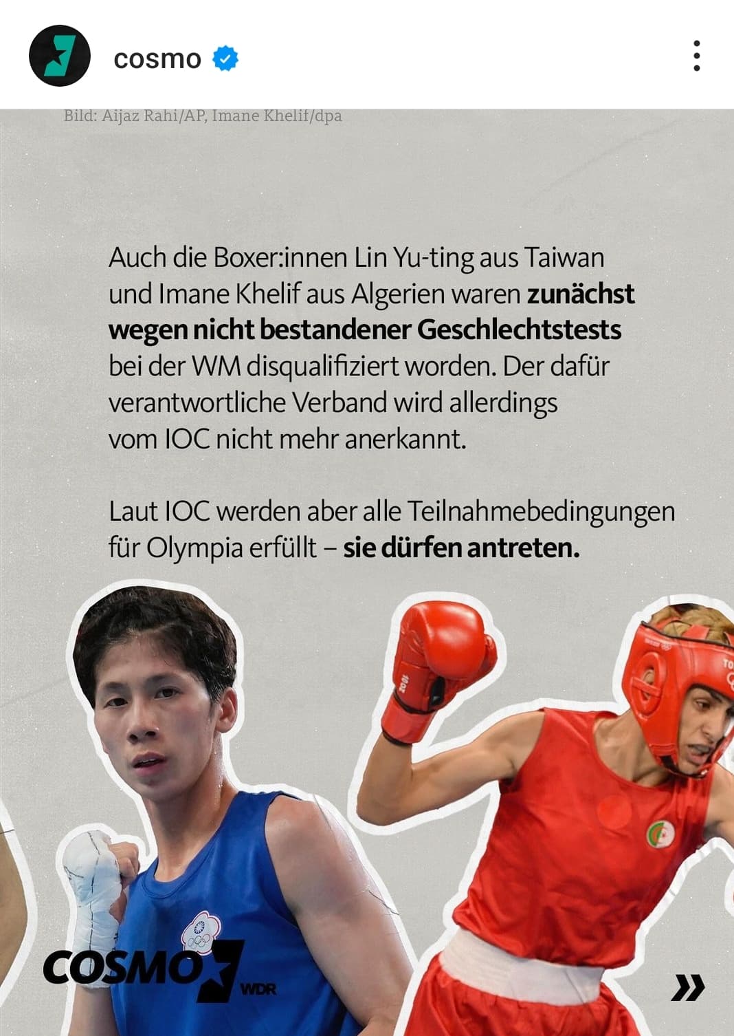 Der Fall von 2 offensichtlich männlichen Boxern Lin Yu-ting und Imane Khelif, die bei Olympia im Frauenboxen antreten dürfen, macht insbesondere auf Social Media groß die Runde und was machen die Öffentlich-Rechtlichen, die Olympia übertragen? Keine Meldung, kein Bild, nichts auf deren Seite…