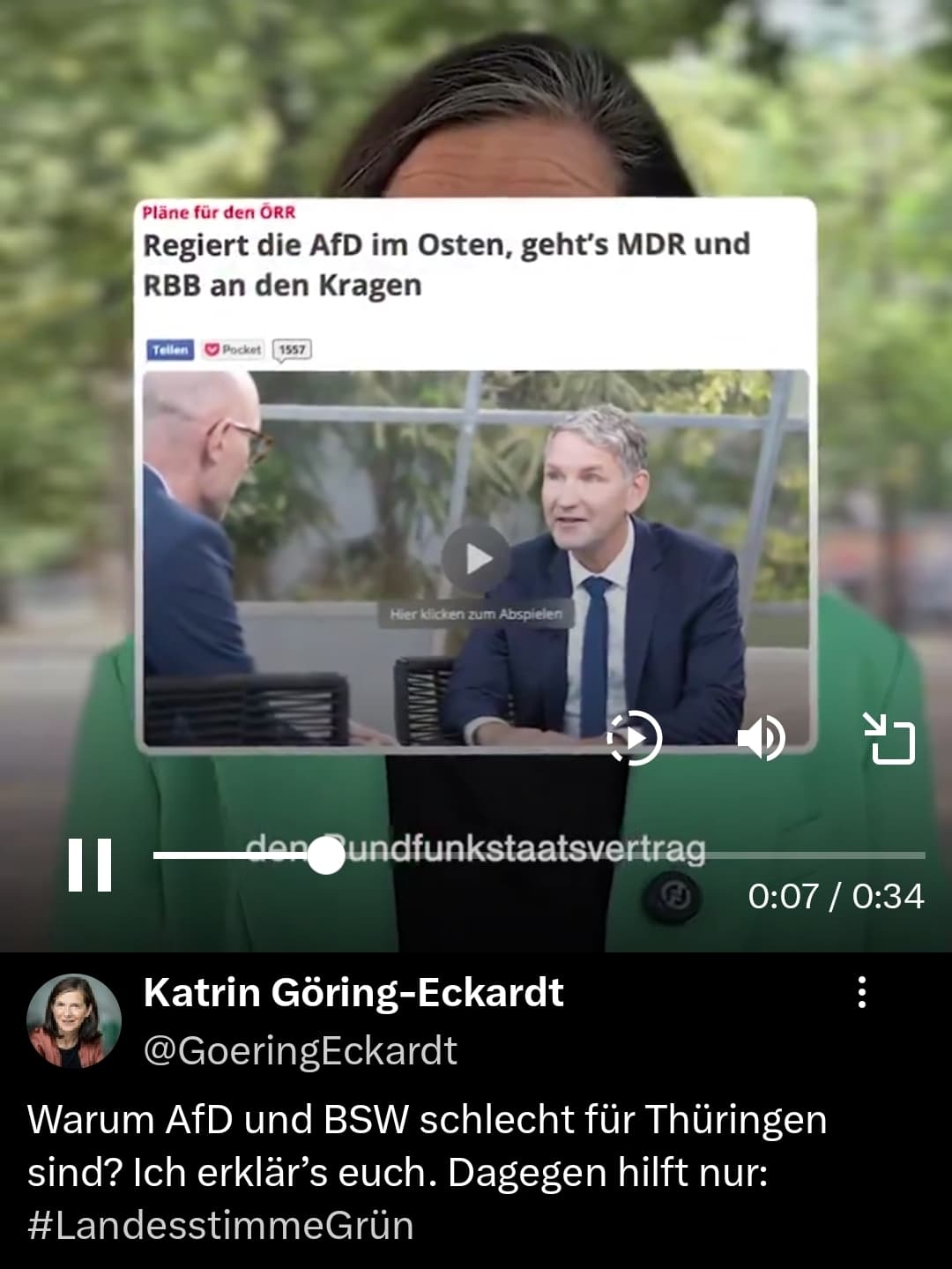 Frau Göring-Eckardt warnt auf X davor, dass die AFD den Rundfunkstaatsvertrag kündigen wird. Folgen: Riverboat und Florian Silbereisen zu Weihnachen wird es „an den Kragen gehen“. Ist das dann ein Beitrag pro AFD? ![]()