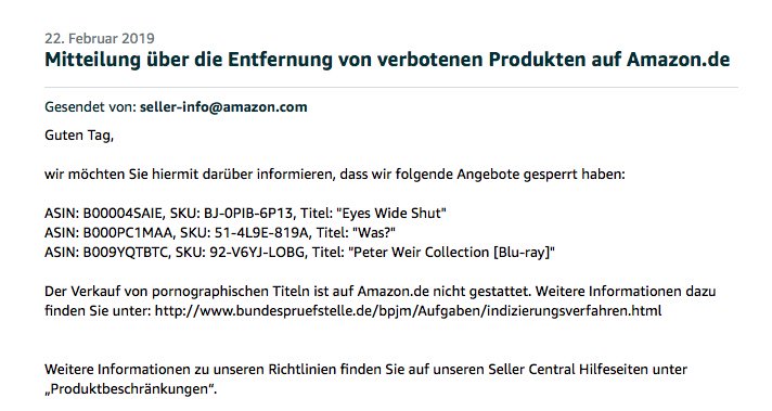 Aktuell scheint Amazon wieder den Sittenwächter raushängen zu lassen und schmeißt u.a. diverse Filme aus dem Programm die sexuellen und/oder frauenfeindlichen Inhalt haben sollen. Trifft aber eher harmloses Zeugs, teilweise Kinderfilme. Da soll wohl eine Art automatischer Filter grob drüber wischen. Es werden u.a. private Marketplace-Verkäufer aufgefordert ihre Verkaufslisten zu säubern. Sofern sie einen betroffenen Artikel jemals verkauft haben und jetzt nicht mehr anbieten, müssen sie trotzdem diese Karteileichen entfernen, sonst könnte es eine Sperre geben. Auch werden Verkäufer aufgefordert entsprechende Titel zurückzunehmen und den Kaufpreis zu erstatten. Ebenfalls wird damit gedroht, dass Amazon die Ware vernichtet, die über deren Lager verschickt wird.