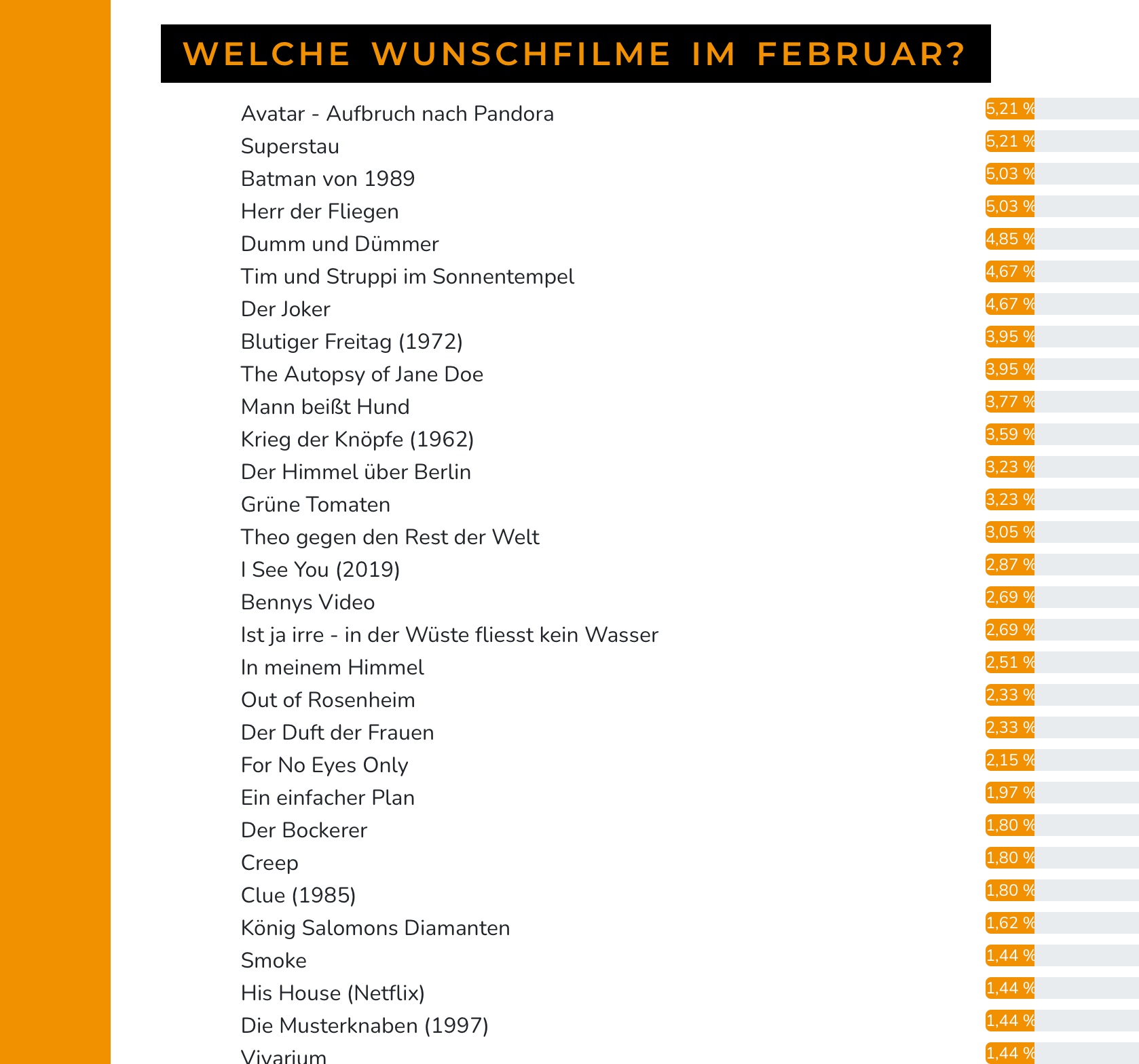 Smoke ist wirklich mal ein guter Vorschlag! Also der hätte ruhig mal weiter vorne landen können. Aber das ist ja immer so und es heißt ja eh „Massengeschmack“, von daher nun also Avatar natürlich auf eins. Bin mal gespannt (also ein bisschen), worum es da geht, nie gesehen. So lernt man das auch mal kennen.